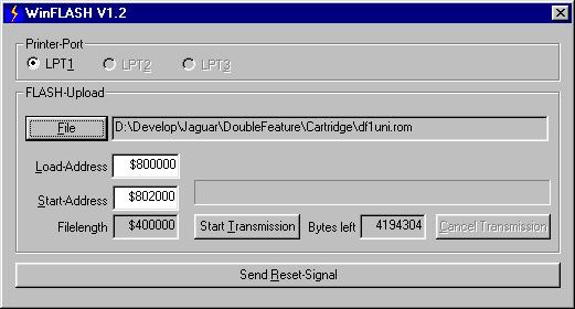 WinFLASH is a Microsoft Windows-based userinterface for uploading Jaguar-cartridge-programs to Atari's FLASH-card written in 2003 by Matthias Domin.